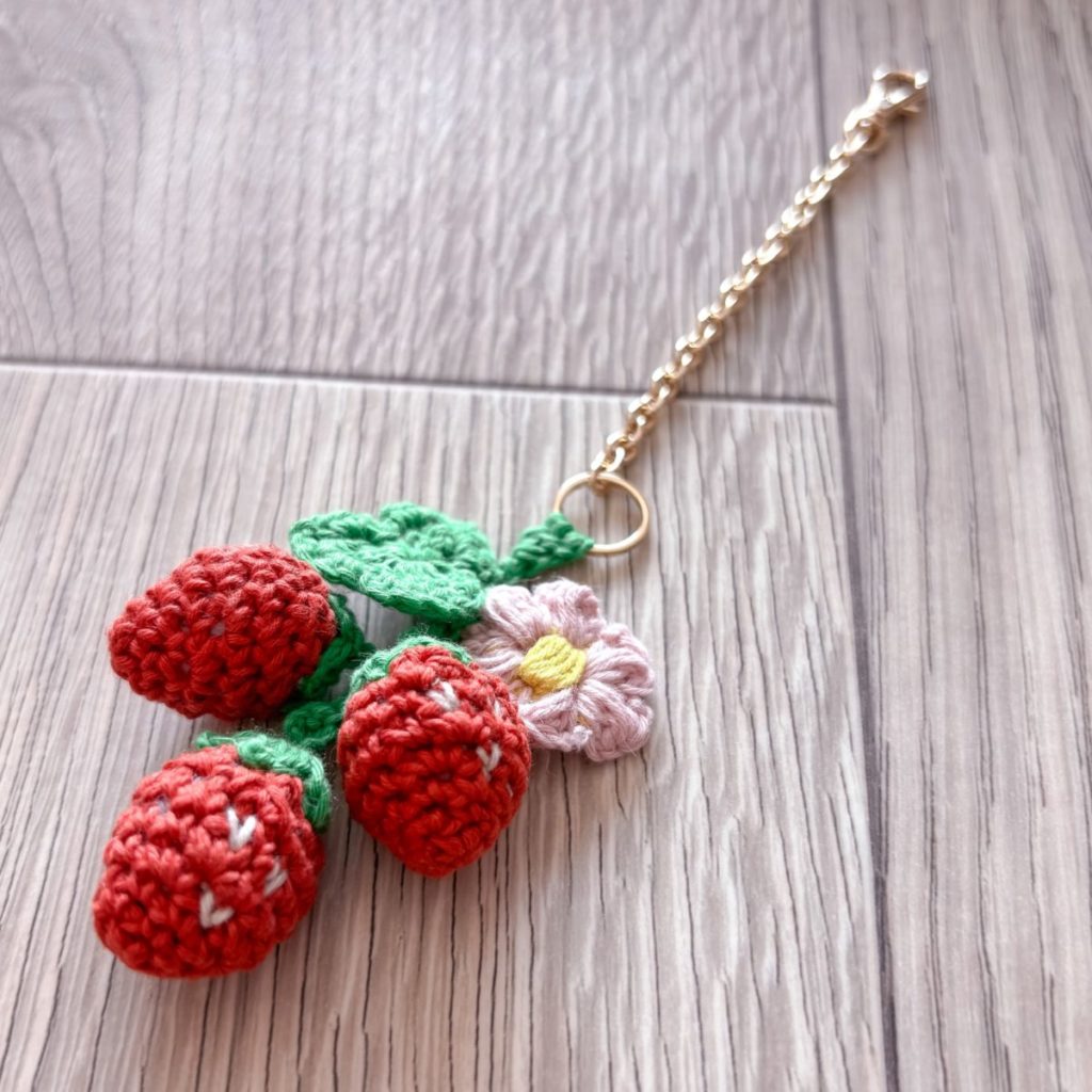 葉っぱモチーフの編み方と、いちご・お花をチャームに仕立てる方法をご紹介します。