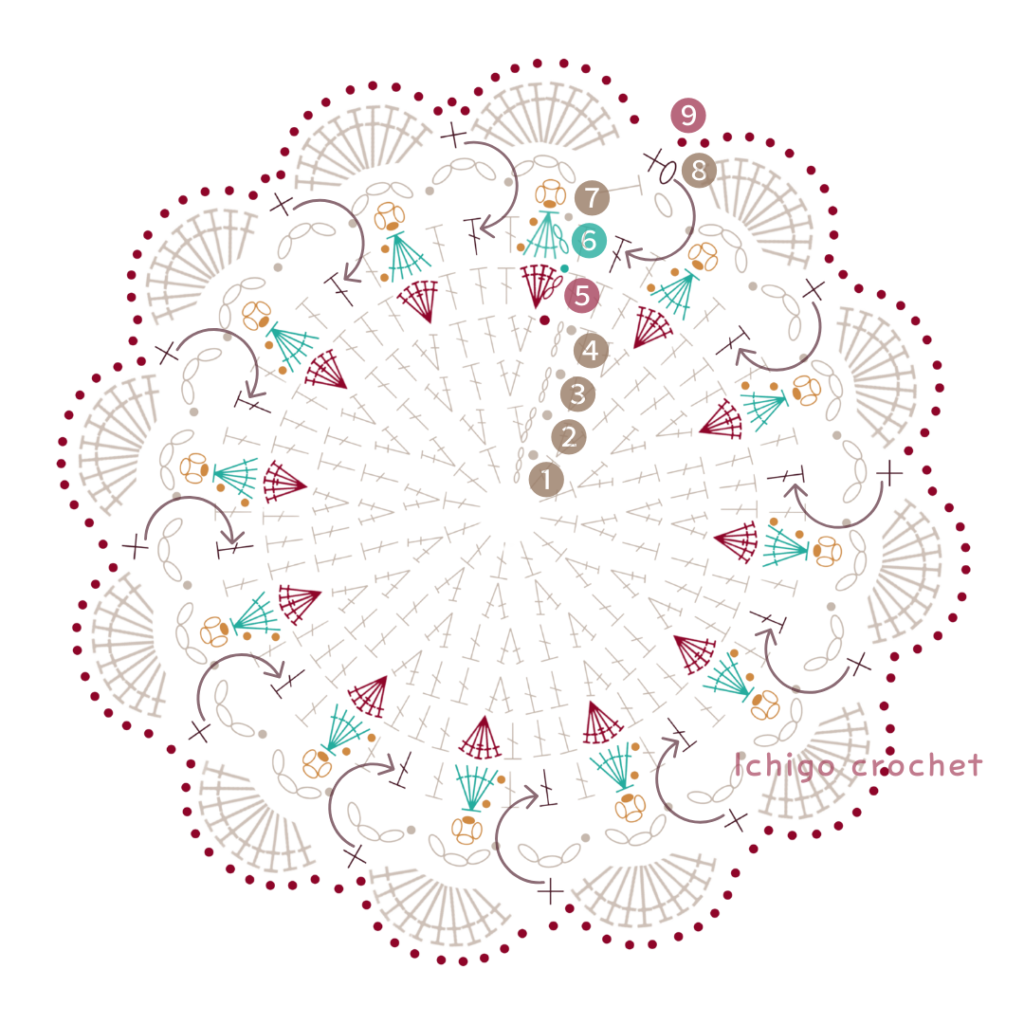 ※8段目のこま編みは、6段目のベージュの長編み3目のうち真ん中の目に編みます。