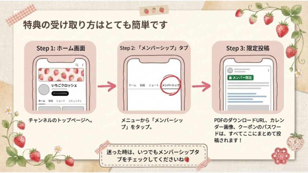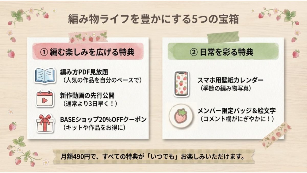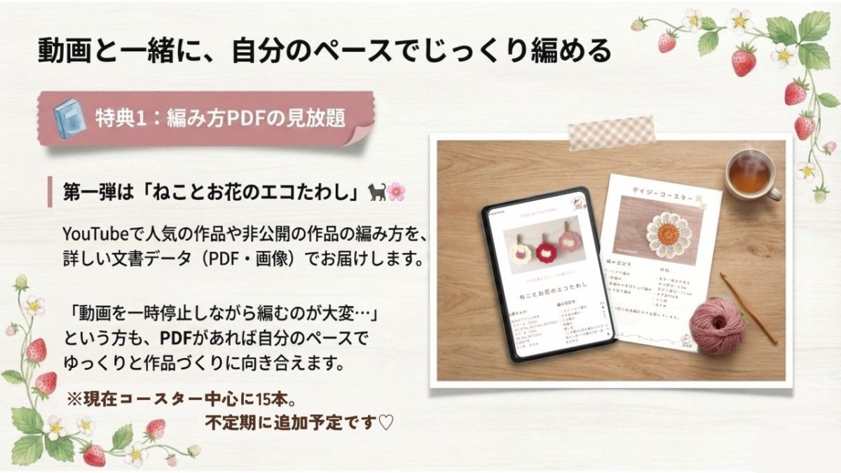 YouTubeチャンネル「いちごクロッシェ-Ichigo crochet-」のメンバーシップ特典が、2026年よりさらに充実しました!最新の内容をご紹介します。