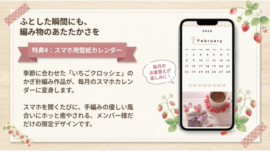 季節の編み物作品の写真を使用した、メンバー限定デザインの壁紙(カレンダー付き)を毎月提供しています。