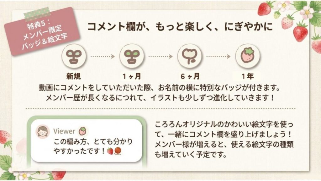 コメント欄でお名前の隣に表示される「メンバー用バッジ」や、限定の「カスタム絵文字」が使えるようになります。バッジは継続期間に応じてデザインが変わっていきます。